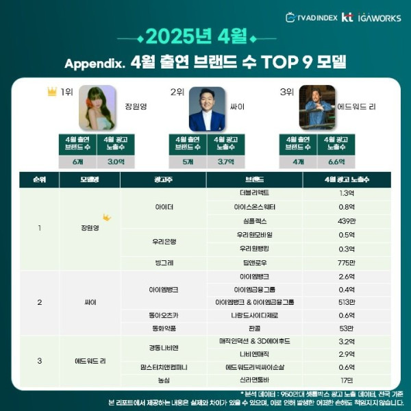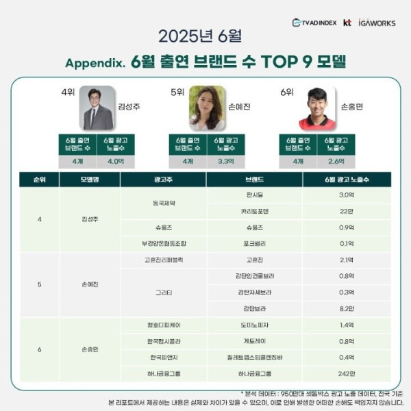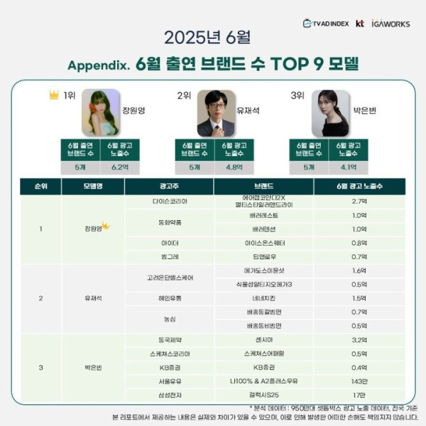 2025년 6월 광고모델 연예인 TOP 9