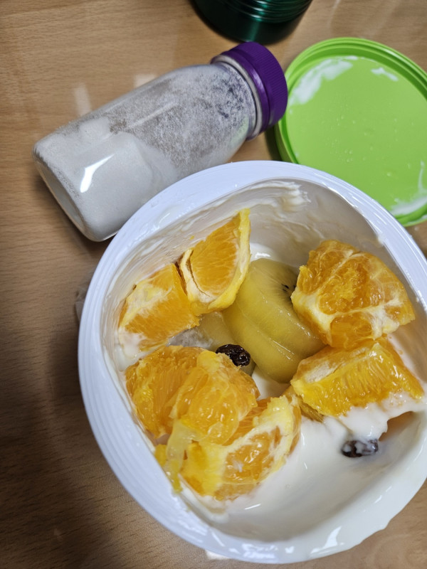 아침부터 요플레 남은거에다가 키위 오렌지 건포도 때려박아서 가져왔어요 ㅋㅋㅋㅋ